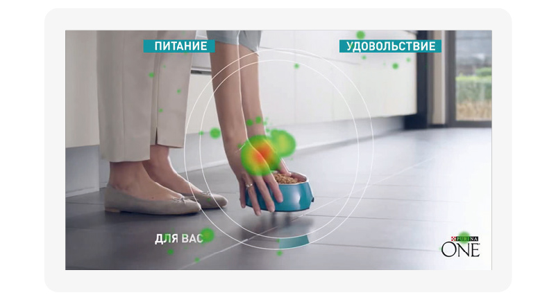 Здесь показаны коробочки с кремом, где надпись размещена на контрастном розовом фоне, а больше в кадре нет ничего, задний план размыт. Демонстрируются 3 варианта упаковки и слоган. Можно с уверенностью сказать, что зрители читают его. Но самое главное – то, что этот план с тремя коробочками показывается очень долго для такого короткого ролика – 4 секунды. Зрители успевают рассмотреть все коробочки и в итоге взгляд возвращается к центральной. Судя по тепловой карте, многие пытаются прочитать надпись на коробке.
