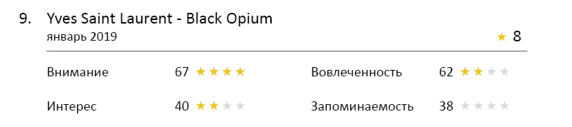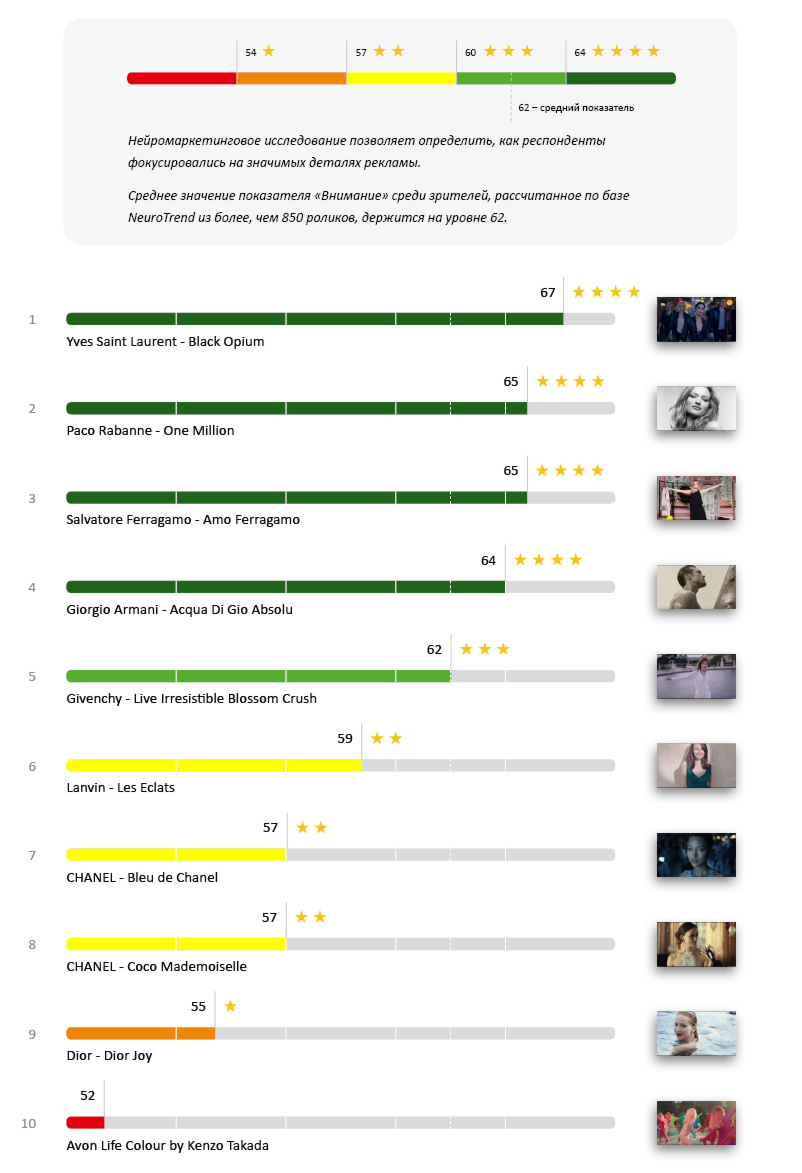 Борьба рекламы за внимание зрителей продолжается, и на этот раз в рейтинге «сразились» 10 рекламных видеороликов парфюма. Участники приложили немало усилий, но не всем удалось заслужить максимальное количество звезд. В лидеры по показателю «Внимание» выбились: Yves Saint Laurent - Black Opium (67 баллов), Paco Rabanne - One Million и Salvatore Ferragamo - Amo Ferragamo (по 65 баллов), Giorgio Armani - Acqua Di Gio Absolu (64 балла).